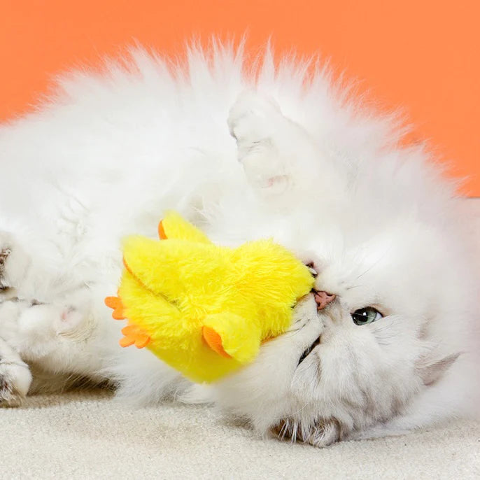 This Electric Flapping Duck Toy Cat Kicker Toy is the best interactive and self-play cat toy for cats and kittens. The interactive bouncing duck toy is the best cat toy and responds to touch and starts and stops based on your cat's interaction. Perfect Thanksgiving, Christmas and New Year gift for cats and kittens. Only available at Lil Wild Pets. Features: Every time your feline touches this interactive, battery-powered cat kicker toy, the automatic built-in motion sensor kicks into action and the cat teaser duck toy flaps and flutters like a real duck, intriguing your cat to kick and play. A Duck That Quacks: Make play fantastic with the fluffy duck, which makes lifelike quack sounds once playtime begins, beckoning every bat, bite, chew, and chase! A Catnip Pouch is included in the package, most cats can get excited and happy at the smell of catnip, and is effectively conducive to getting lounging cats up and moving Simply charge the battery pack, insert it into the duck's belly, turn it on, and tap the belly to begin the fun. Charges in about an hour and a half and can keep your cat entertained for nearly an hour on a single charge. You can hide catnip inside the duck's belly to entice your cat and start playtime. Hand-wash and machine-wash the duck after removing the battery. Intended For: Cats Includes: The plush duck body, a rechargeable battery pack, a USB charging cable, and a tube of catnip are all included. Activity: Hunt & Stalk, Swat & Pounce Color: Yellow Dimensions: 4.5"