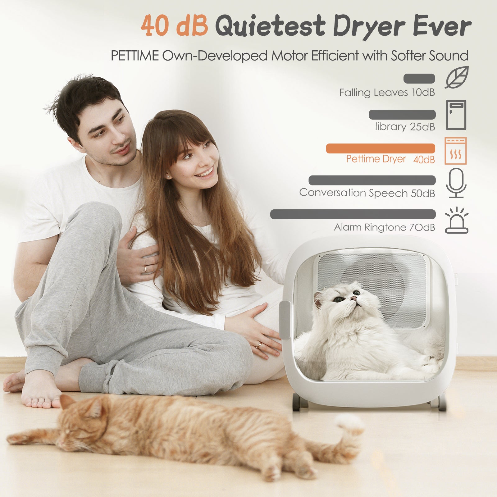 PETTIME Pet Dryer Lite sets inside and duel circulation simulation of natural wind to provide pets with the comfortable, safe, and fast-drying process.