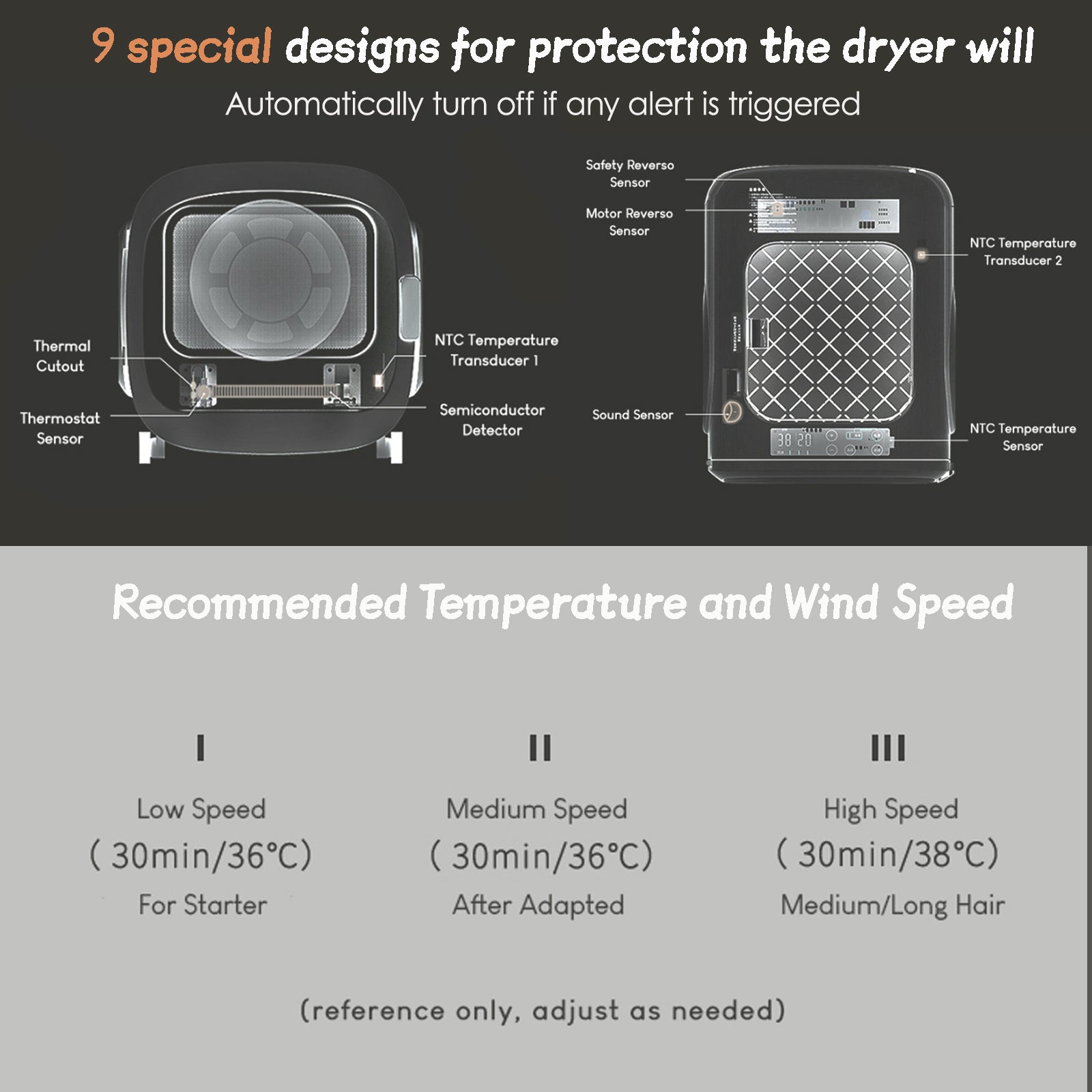 - Innovative design for easy access and 180° view, side window can be opened, easy to comfort your pet during the drying process.